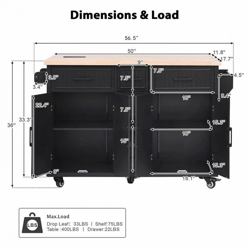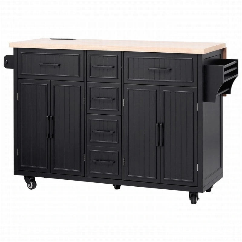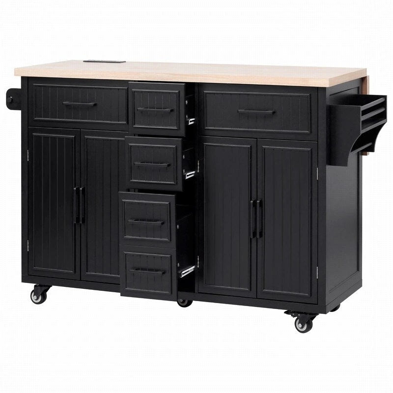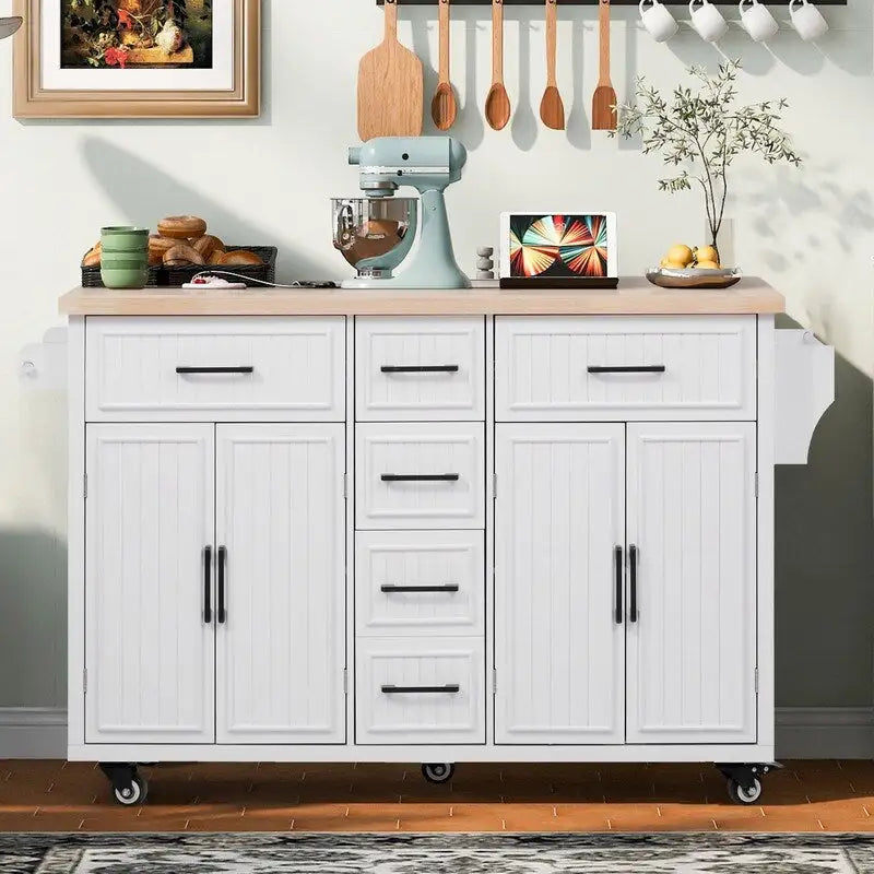 Îlot de cuisine de 56,5 pouces avec abattant et station de recharge, chariot de cuisine roulant sur roulettes avec tiroirs et étagères réglables