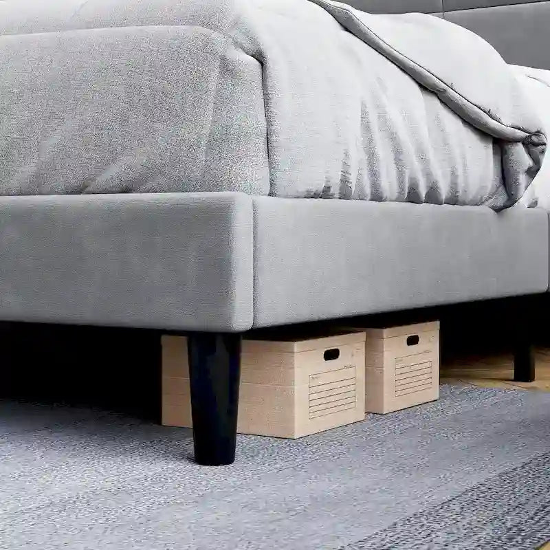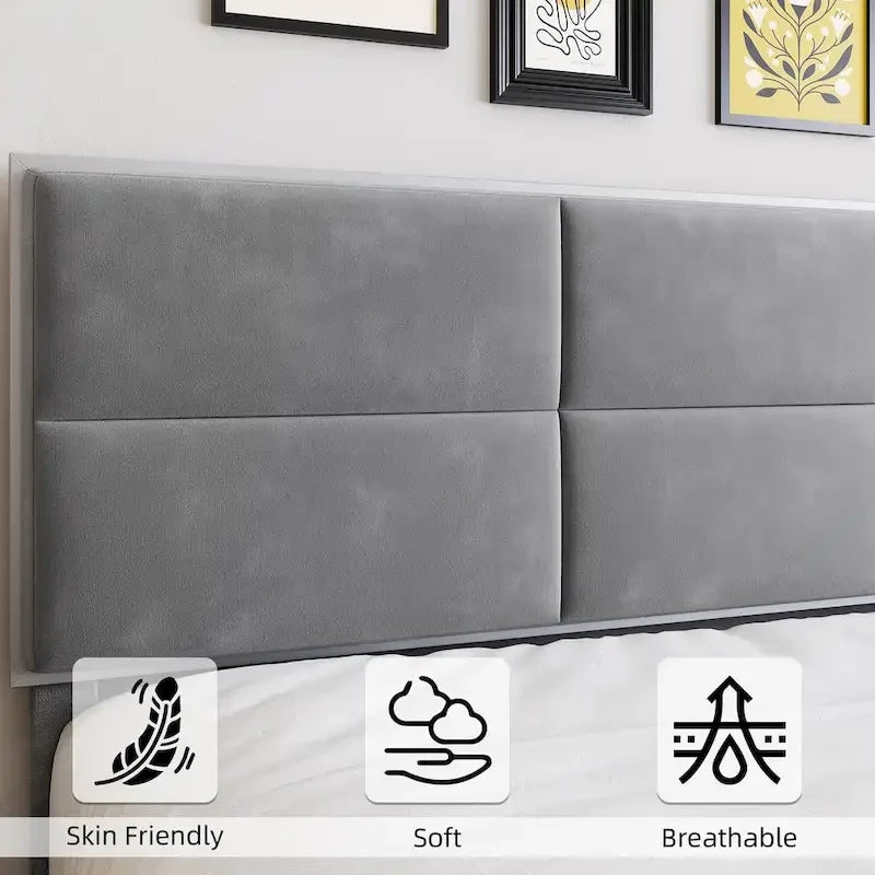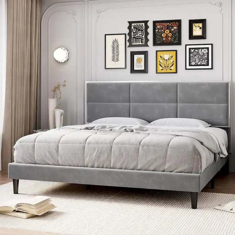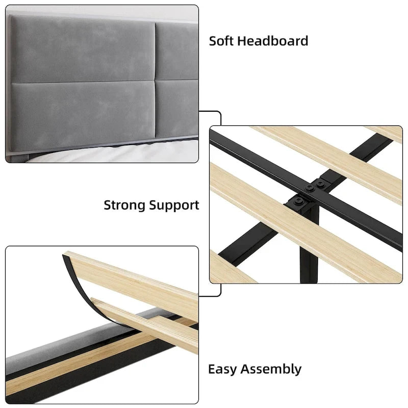 DESIGN ÉLÉGANT : Cadre de lit plateforme queen avec tête de lit capitonnée en velours et rembourrage en mousse à mémoire de forme haute résilience. Imaginez-vous vous détendre sur ce cadre de lit queen avec un livre ou un café. Le velours de haute qualité dégage une atmosphère chaleureuse et moderne, tandis que ses motifs géométriques 3D ajoutent une touche chic. La plateforme basse est pratique pour tous les âges, ce qui en fait un cadeau idéal pour toute la famille. ROBUSTE ET DURABLE : Les cadres de lit Trailblaze allient harmonieusement robustesse et élégance. Fabriqués en métal durable et en bois de première qualité, ils sont dotés de lattes en bois massif et de pieds de soutien centraux, assurant une stabilité remarquable et supportant jusqu'à 450 kg. SILENCIEUX : Profitez de nuits paisibles grâce à notre cadre de lit queen silencieux. Les lattes fixes et équidistantes éliminent les bruits de la structure en acier, améliorant ainsi votre environnement de sommeil et vous permettant de profiter de nuits paisibles, sans interruption. SOMMIER NON REQUIS : Notre cadre de lit queen size se passe de sommier. Les lattes en bois massif offrent un excellent soutien à différents types de matelas. Économisez temps et argent en posant simplement votre matelas directement sur les lattes. INSTALLATION FACILE : Nous avons simplifié le processus d'installation. Grâce à des instructions claires, le montage est un jeu d'enfant et votre cadre de lit idéal sera prêt en moins d'une heure. Détendez-vous dans votre nouveau havre de paix en seulement 30 minutes.