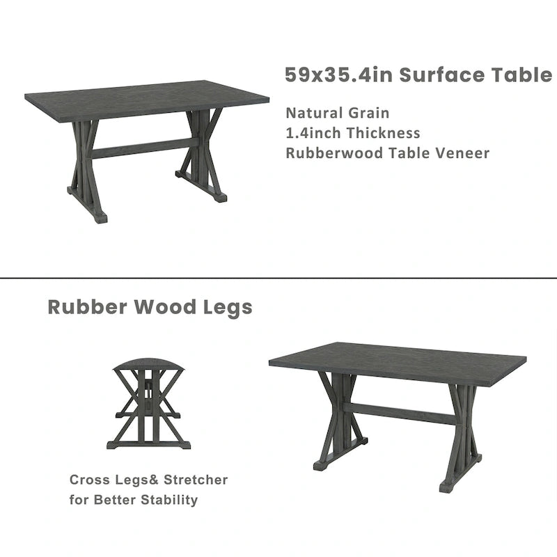 Envie de transformer votre salle à manger ? Découvrez cet élégant ensemble 6 pièces en bois massif, composé d'une table rectangulaire à la texture riche et aux pieds tréteaux classiques. Appréciez le confort moelleux de quatre chaises rembourrées et d'une banquette capitonnée, supportant chacune jusqu'à 113 kg, tandis que la table robuste supporte jusqu'à 136 kg. Disponible en deux coloris tendance, cet ensemble est idéal pour créer des repas mémorables.
