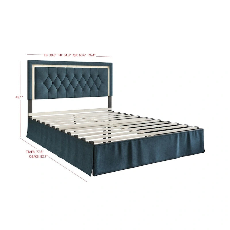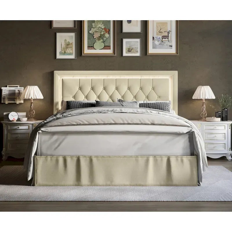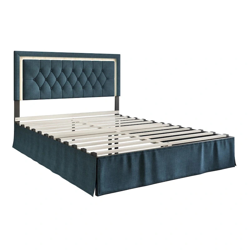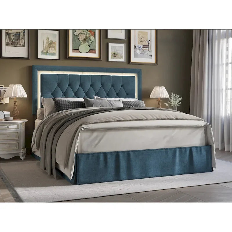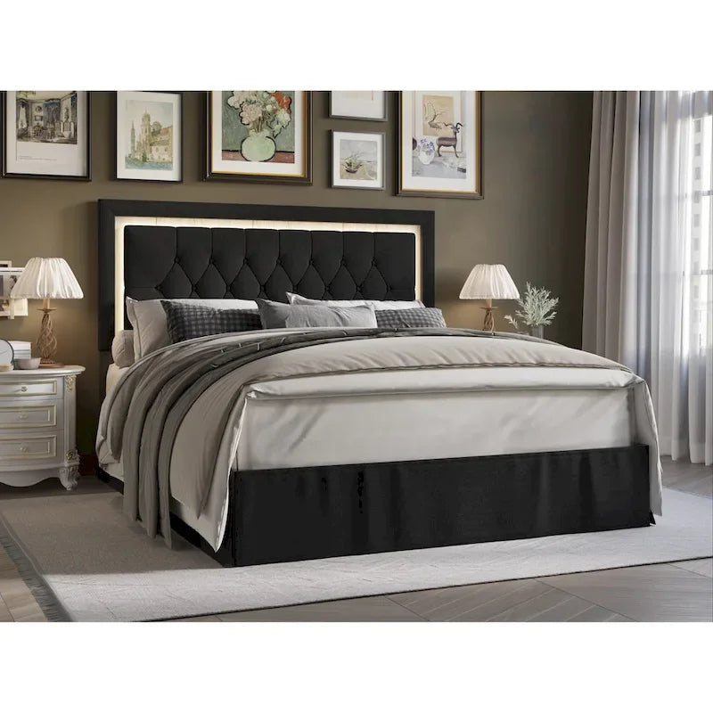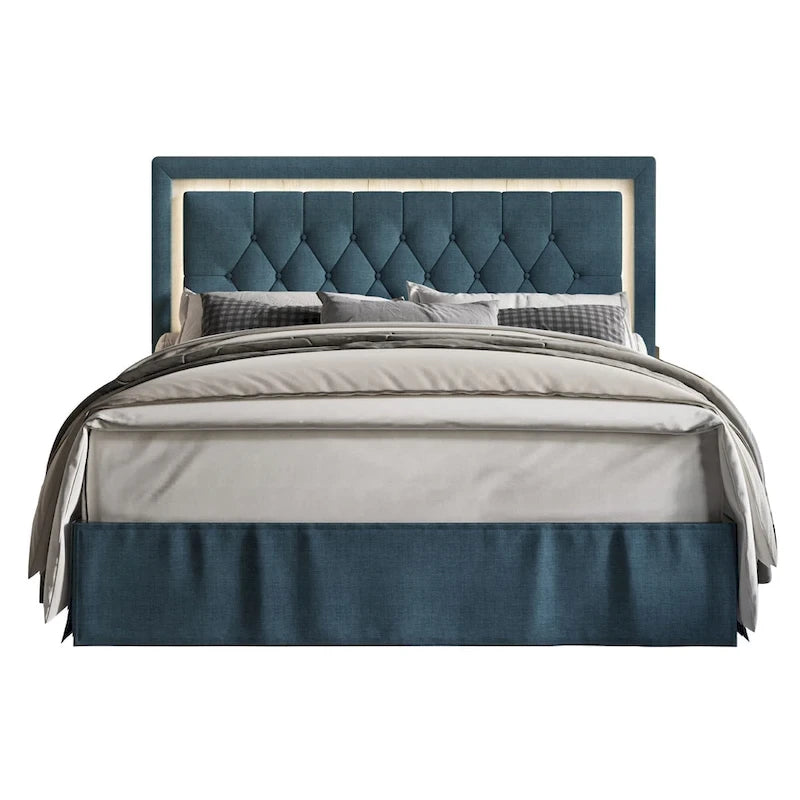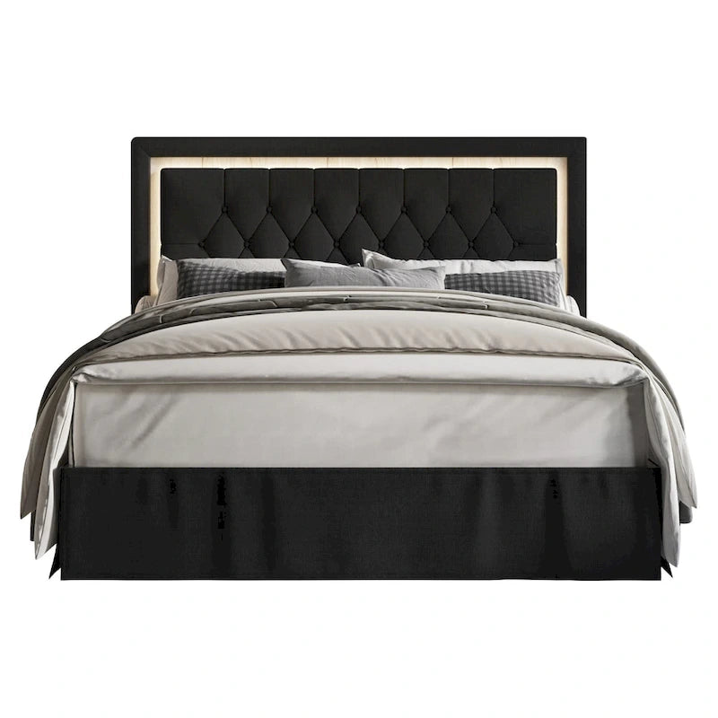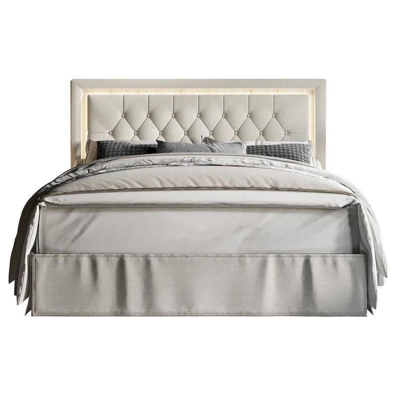 Sublimez votre chambre avec ce lit plateforme capitonné au style moderne. Sa tête de lit rectangulaire épurée est ornée de capitons et de lumières LED tactiles sur les bords. Un élégant cache-sommier dissimule l'espace de rangement sous le lit. Disponible en quatre tailles (simple, double, queen et king) et quatre coloris (gris chaud, beige, bleu denim et noir), ce lit est idéal pour votre chambre.