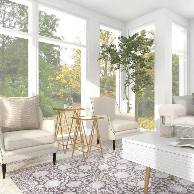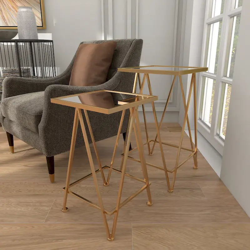 - Fabriqué en fer et en verre miroir, cet ensemble de tables d'appoint dorées arbore un design scintillant à la fois attrayant et durable.