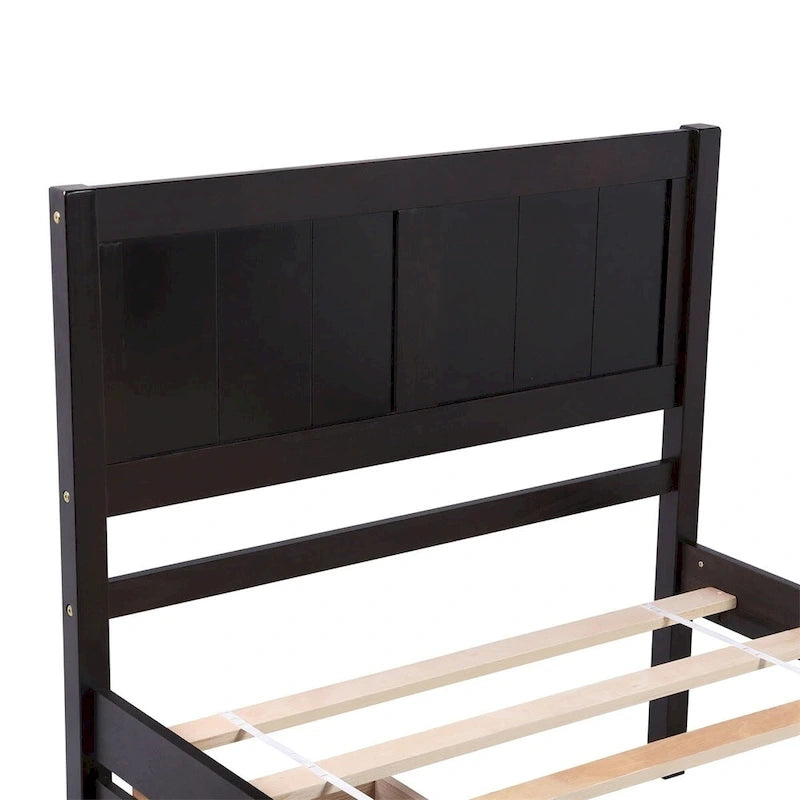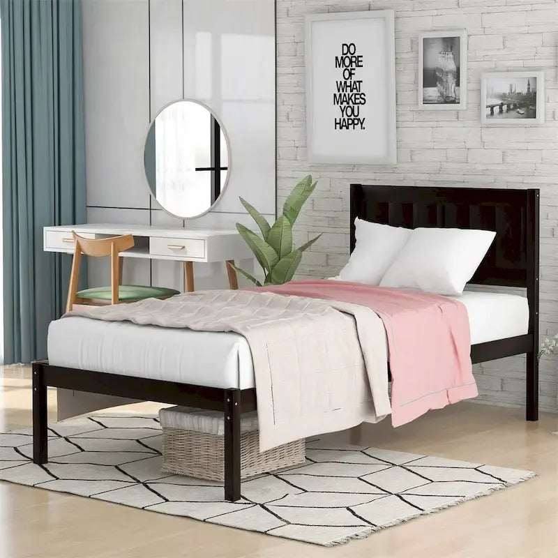 Ce lit plateforme en bois pour une personne est un modèle classique qui s'harmonise avec différents styles de décoration et vous permet d'embellir votre espace. Ce lit plateforme est doté d'une tête de lit et de lattes en bois pour un soutien optimal. Sa belle finition lui confère une allure élégante et en fait un excellent ajout à toute chambre.
