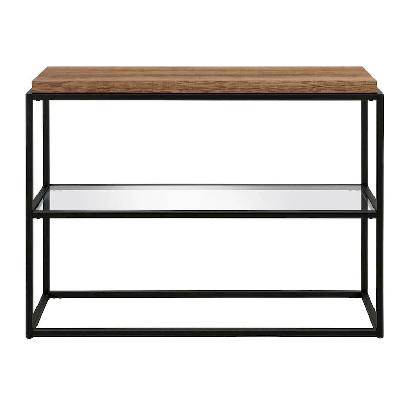 Créez une ambiance chaleureuse avec cette console épurée et fonctionnelle. Sa structure en bronze noirci contraste avec le plateau en chêne gris et l'étagère inférieure en verre. Placée derrière le canapé ou servant de présentoir à une collection d'objets décoratifs, cette console est le support idéal pour une mise en scène digne d'un magazine.