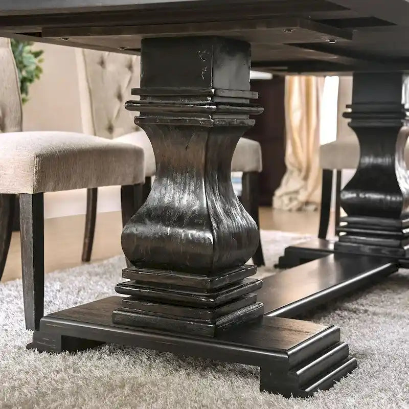 Cet ensemble de salle à manger sept pièces, comprenant une table et six chaises, évoque le charme rustique d'une maison de campagne. Sa finition en bois à grain rustique lui confère une touche d'élégance supplémentaire. La table repose sur un élégant piètement à tréteaux, créant une ambiance chaleureuse. Les chaises, revêtues d'un tissu capitonné à l'aspect lin, apportent une note raffinée à votre salle à manger. Le design en volute des chaises ajoute une touche de sophistication discrète à votre espace repas.