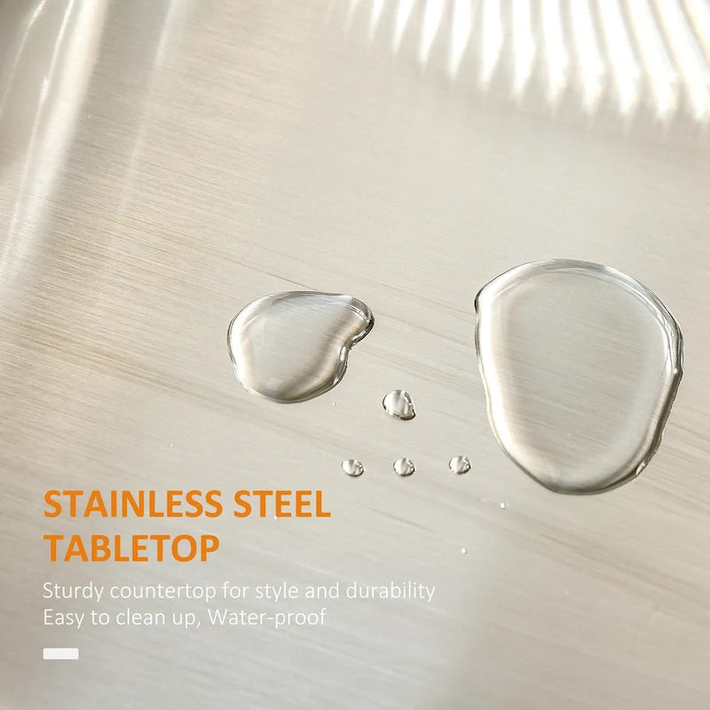 - Préparation des aliments : Le plan de travail en acier inoxydable offre une surface lisse et sûre pour toutes vos préparations culinaires, pour hacher ou couper, tout en étant facile à nettoyer d’un simple coup de chiffon ou d’essuie-tout.