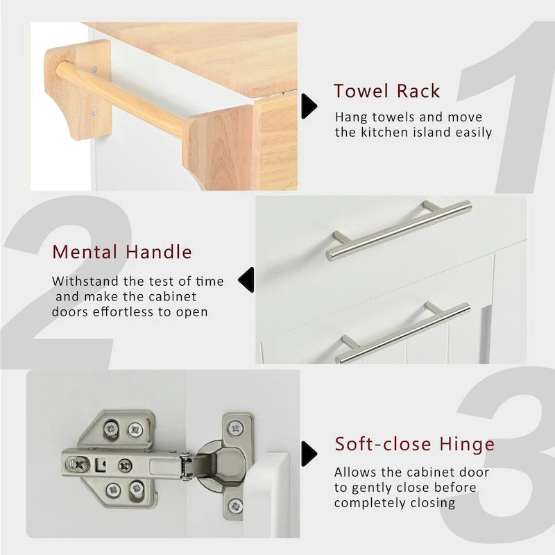 [Organisateur de rangement coulissant à 3 niveaux] Notre îlot de cuisine est équipé d'un organisateur de rangement coulissant à 3 niveaux très pratique. Chaque niveau a la même largeur, mais une hauteur différente. De plus, l'étagère du niveau intermédiaire est réglable en hauteur, ce qui permet de s'adapter à vos besoins d'aménagement et de ranger des objets de différentes tailles. [Rangements internes] Inspiré du design des portes de réfrigérateur, cet îlot de cuisine est doté de rangements internes. Ces rangements optimisent l'espace et la capacité de rangement, vous permettant ainsi de profiter pleinement de votre cuisine, salle à manger ou salon. [Abattant pratique] Le plan de travail de cet îlot est équipé d'un abattant. En cas de manque d'espace, il vous suffit de l'ouvrir pour gagner de la place et ainsi disposer de plus d'objets sur le plan de travail et augmenter votre capacité de rangement. Bien sûr, vous pouvez le plier lorsque vous ne l'utilisez pas, et l'appuyer contre un mur ou dans un coin constitue une bonne solution de rangement. [Îlot de cuisine mobile] Notre îlot de cuisine mobile sur roulettes est équipé de cinq roulettes universelles mobiles : quatre aux quatre coins inférieurs et une au centre. Ainsi, vous pouvez vous déplacer librement et en toute stabilité. Deux des roulettes sont verrouillables, ce qui vous permet de l'immobiliser à tout moment. Un atout considérable pour votre confort d'utilisation en intérieur.