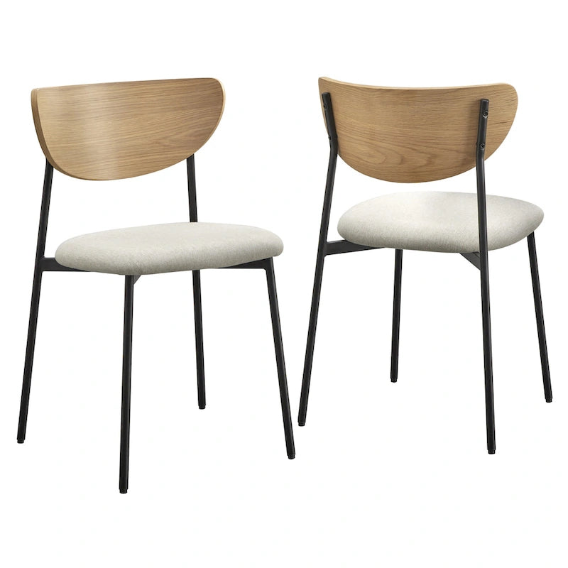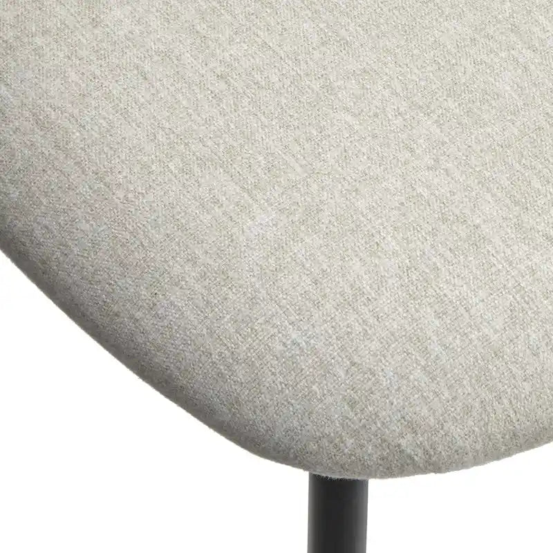 - Chaise fabriquée avec une assise en contreplaqué, un dossier en bois stratifié et plaqué, un revêtement en tissu aspect lin et de la mousse, et des pieds en métal.