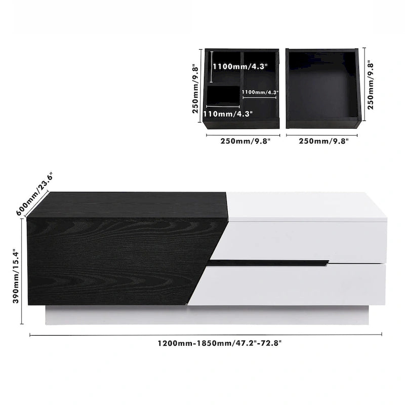 - La table basse moderne extensible à plateau coulissant avec rangement, disponible en blanc et noir, est fabriquée en MDF et en bois composite. Elle allie design innovant et fonctionnalité. Son plateau coulissant extensible et son grand espace de rangement en font un complément idéal pour les intérieurs contemporains, alliant praticité et esthétique.