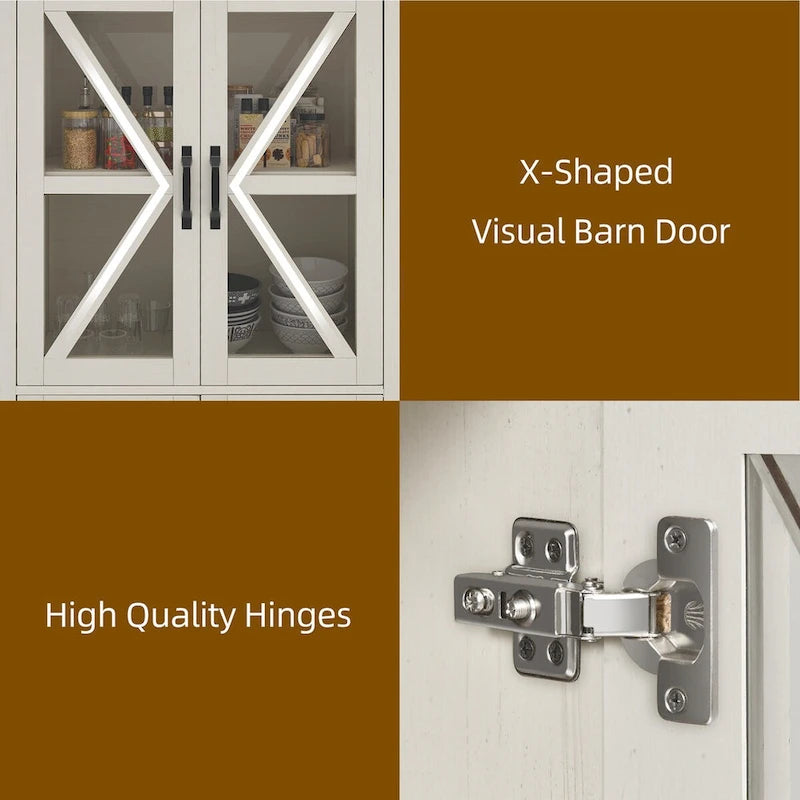 Charme champêtre : les barres décoratives sur les portes et les côtés confèrent une esthétique champêtre classique. Rangement polyvalent : Quatre étagères spacieuses pour organiser les ustensiles de cuisine, les livres ou les objets décoratifs.