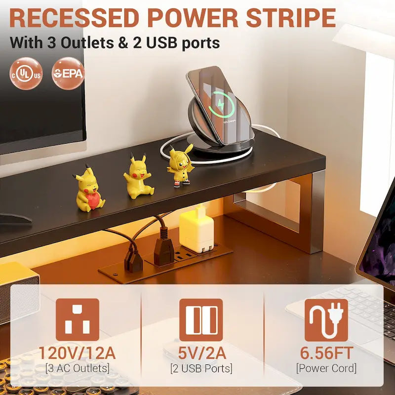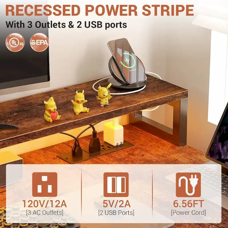 Ce bureau d'angle de 168 cm (66 pouces) offre de nombreux rangements : deux tiroirs à dossiers suspendus en tissu, deux étagères inférieures, un compartiment pour imprimante et un support pour unité centrale. Il contribue également à maintenir un espace de travail propre et organisé. Équipé d'un support pour écran allongé, il préserve la santé de la nuque et du dos. De plus, il dispose d'une multiprise avec trois prises secteur et deux ports USB, permettant d'alimenter jusqu'à cinq appareils simultanément et facilitant ainsi son utilisation quotidienne. La bande lumineuse LED RGB intégrée est contrôlable via une application dédiée et propose plus de 60 000 couleurs ainsi que des fonctions de synchronisation musicale, pour une expérience immersive. Fabriqué en panneaux de fibres de moyenne densité (MDF) de haute qualité et doté d'une structure métallique robuste, ce bureau garantit stabilité et durabilité, et se monte facilement. Son design réversible le rend compatible avec les bureaux d'angle gauche et droit, s'adaptant ainsi à tous les espaces.