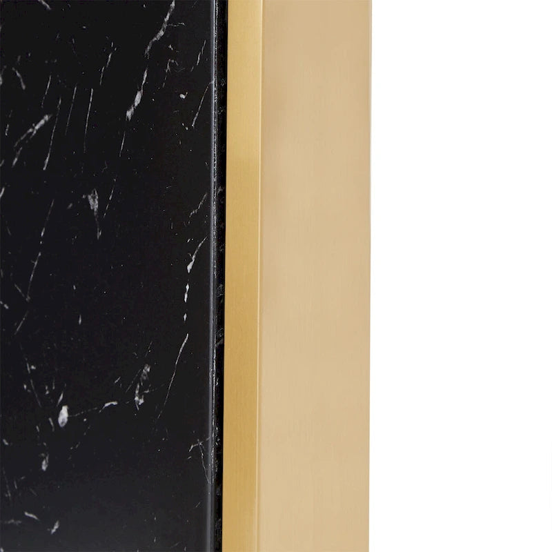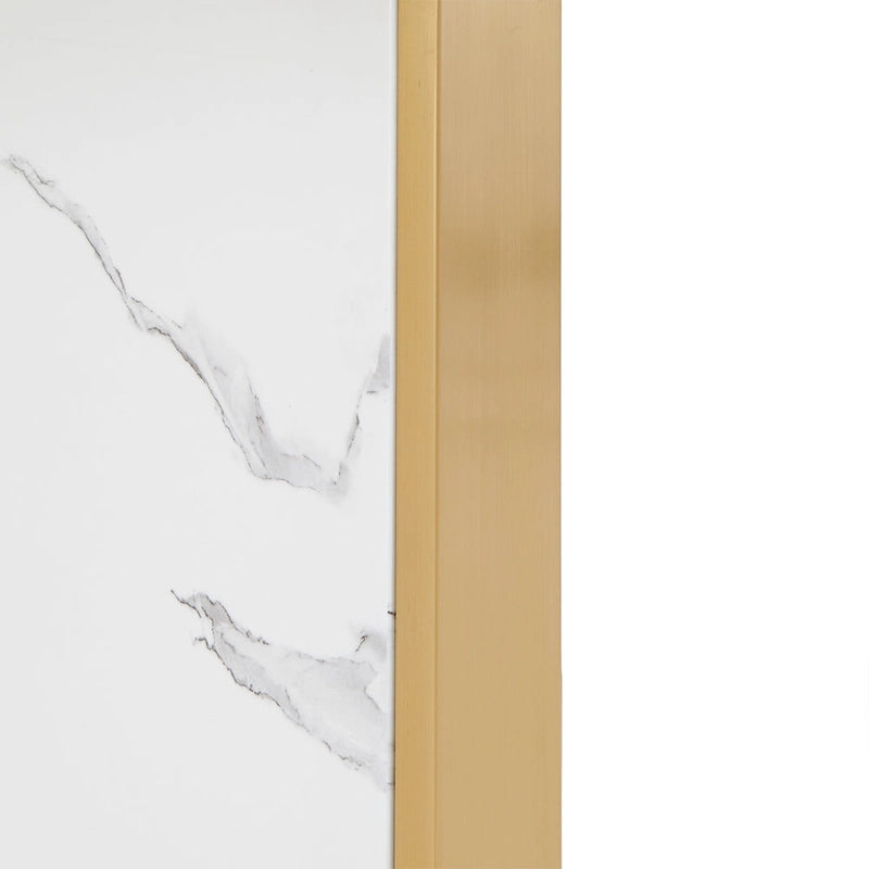 - Table de salle à manger fabriquée en acier inoxydable, imitation marbre et MDF