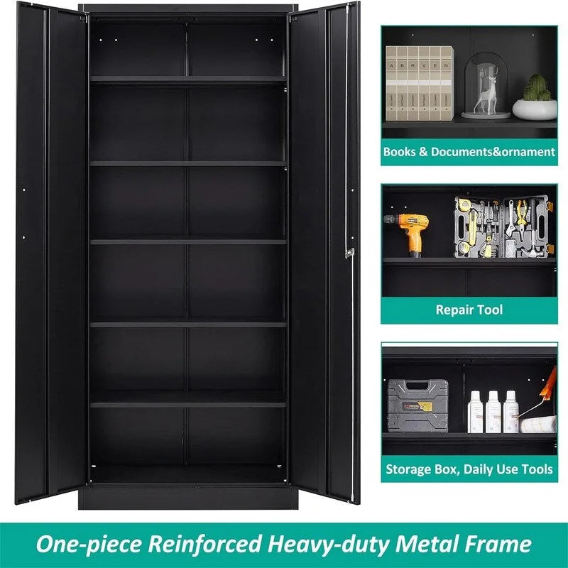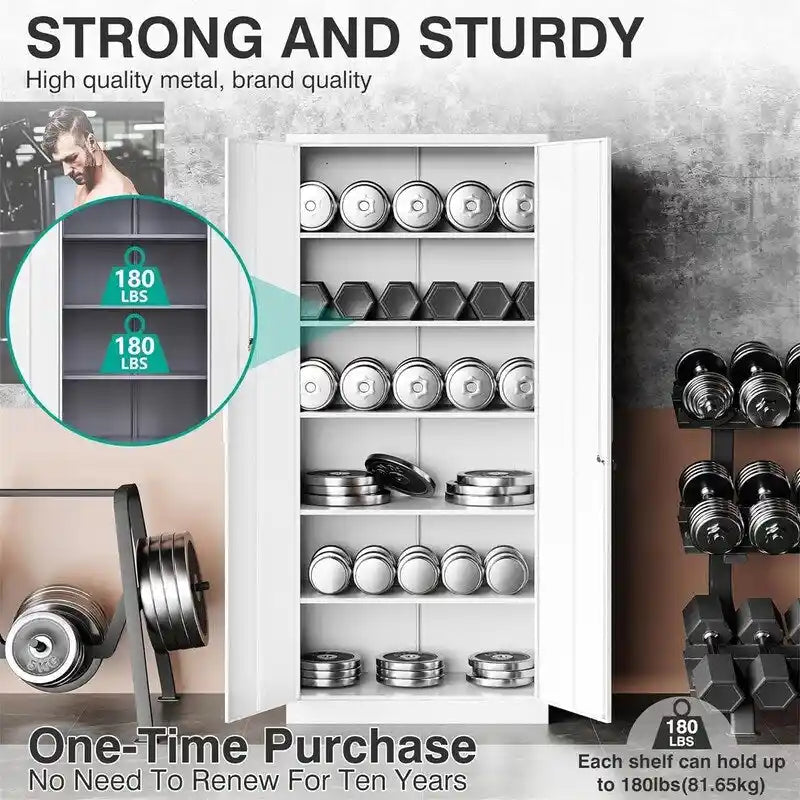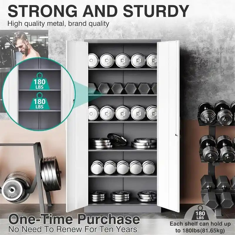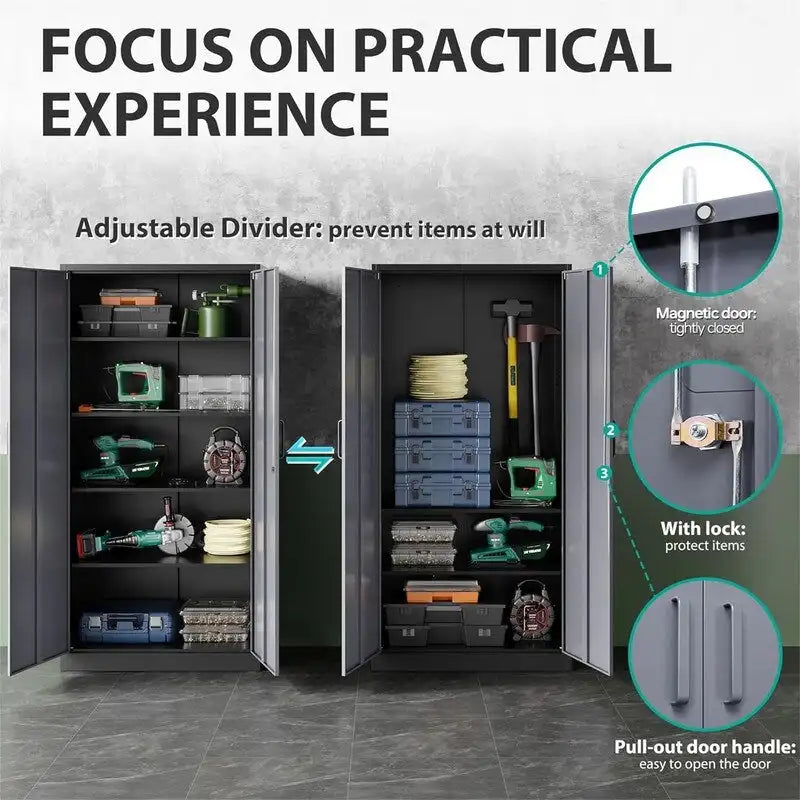 - Armoire de rangement en acier haute résistance avec 5 étagères réglables pour répondre à vos différents besoins de rangement. La serrure des étagères et de la porte protège efficacement vos objets des variations de température, de la saleté et de la poussière.