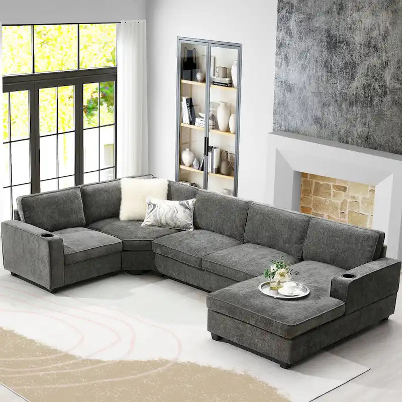 Canapé d'angle en forme de U, ensemble canapé d'angle en chenille avec porte-gobelets