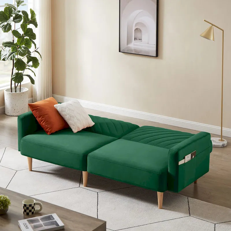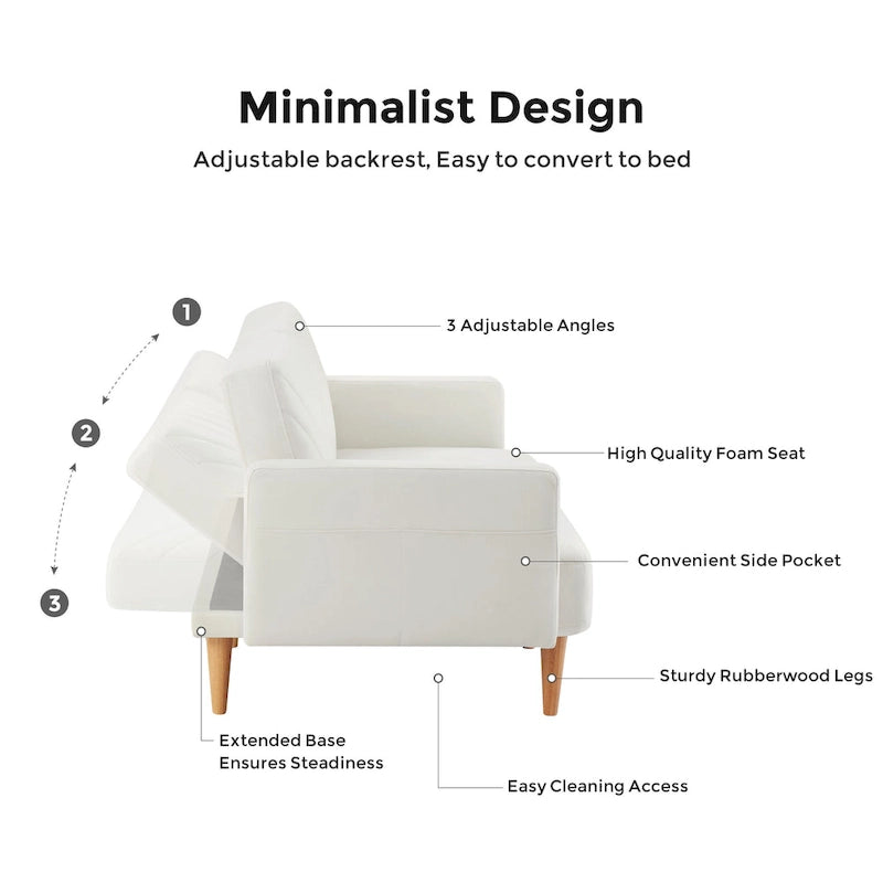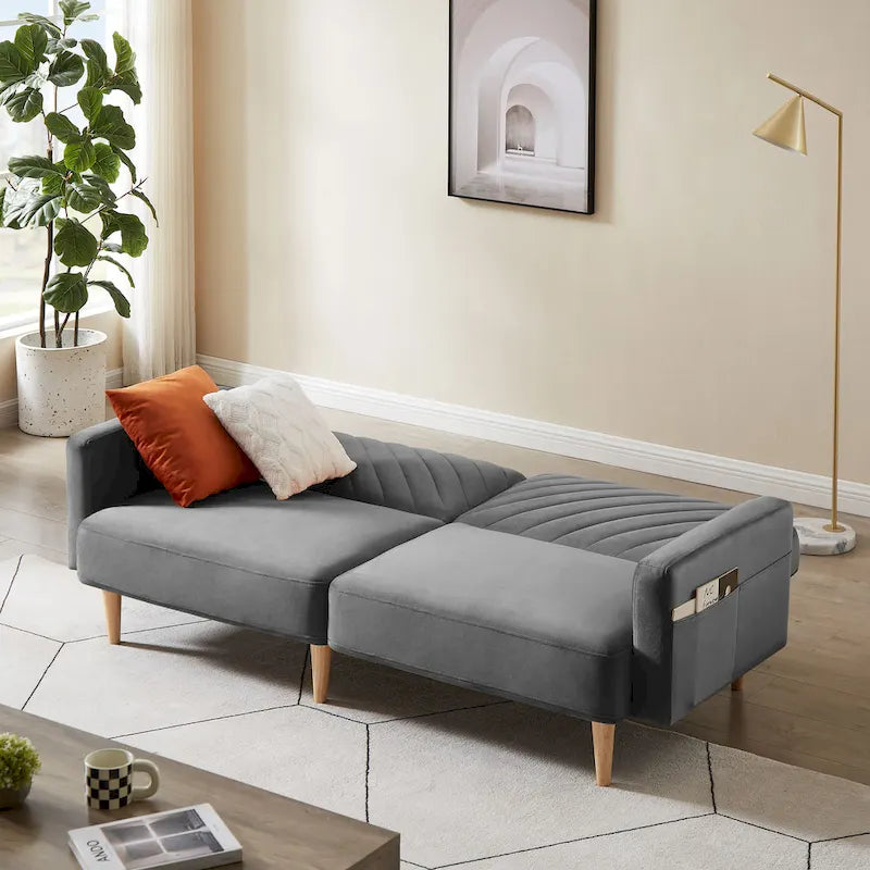Si vous recherchez un meuble qui non seulement agrandit votre espace détente au salon, mais qui en rehausse également l'esthétique, notre élégant canapé-lit convertible est le choix idéal. Grâce à sa conception convertible, ce futon se transforme en trois positions différentes : canapé, méridienne ou lit d'appoint pour accueillir des invités de dernière minute ou pour profiter pleinement de vos soirées cinéma. Ce canapé-lit est également équipé de poches latérales près des accoudoirs pour ranger vos objets du quotidien.